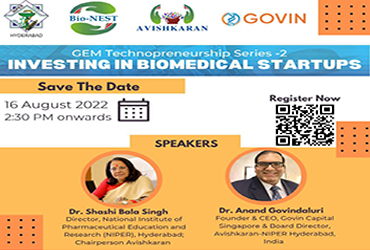 Avishkaran, Bio-NEST, NIPER-Hyderabad organized GEM Technopreneurship Series -2 talk on'Investing in Biomedical Startups'.